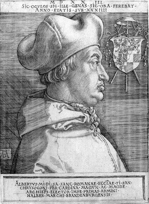 Dieser Albrecht, Bruder des brandenburgischen Kurfürsten Joachim, war schon 1509 als 19-Jähriger und vier Jahre vor seiner Priesterweihe Domherr in Mainz. Mit seiner Wahl zum Erzbischof von Magdeburg ist der nun 23-Jährige wie sein Vorgänger ebenfalls Administrator des Bistums Halberstadt. Er residiert in der Moritzburg zu Halle, möchte aber, um seinen Schäfchen näher zu sein, sich in Halberstadt eine ähnliche Zwingburg errichten, was der städtische Rat jedoch verhindert.