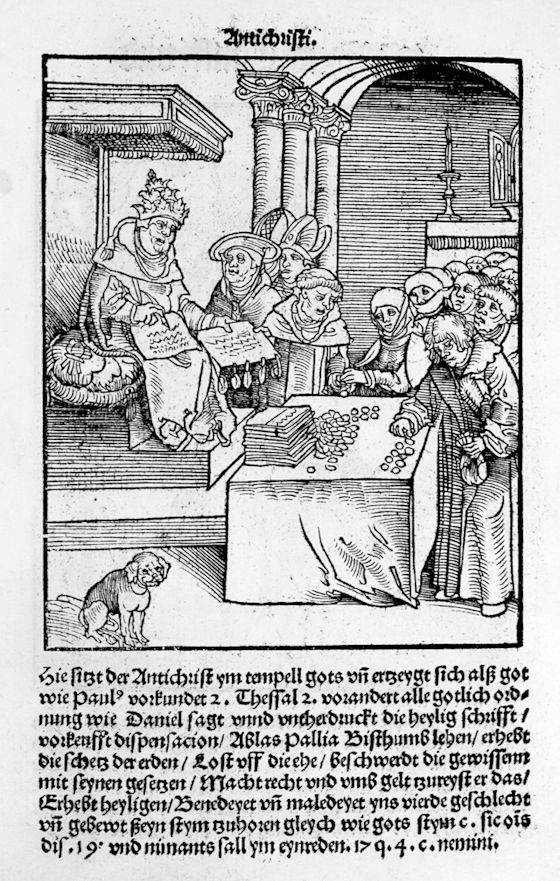 Tetzel auf einem Esel reitend bietet Ablasskram an (Flugschrift) Ablaß ist lauter Büberei und Trügerei, die die armen, einfältigen Christen um Geld und Seele bringet schimpft Luther und prangert in seinen 95 Thesen öffentlich den Ablasshandel an.