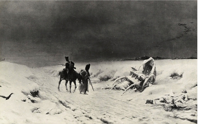 Rückzug aus Russland; Federzeichnung von Adam Klein Auch der Maler Ludwig Richter wird als Neunjähriger Zeuge des Rückzugs: Im Anfange des Jahres 1813 sah ich eines Tages bei wildem Schneegestöber über die Elbbrücke einen Zug wankender Gestalten kommen, die mich sehr frappierten. Die armen, sonderbar vermummten Menschen waren Franzosen, die aus Rußland zurückkehrten. Reiter, aber zu Fuß in Pferdedecken gehüllt, auf Stöcke sich stützend, schlichen gebückt und matt einher. Andere hatten Weiberpelzmützen auf dem Kopfe. Lumpen oder über die schäbigen Uniformen gezogene geraubte Bauernkittel sollten sie vor der schneidenden Kälte schützen. … Diese bejammernswerten Reste der großen Armee gaben Bild und Zeugnis des unbeschreiblichen Elends, welches sie ausgestanden und dem Hunderttausende qualvoll erlegen waren.