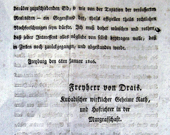 In einer Rede, die von Drais ein Jahr später am 4. Januar 1807 anlässlich der Gründung der Lesegesellschaft in Freiburg hält, schildert er die Reaktionen auf die Übernahme des Breisgaus durch Baden aus seiner Sicht: Als im Anfang des Jänners 1806 die neue Regierung des durchlauchtigsten Kurfürsten von Baden durch das Organ seiner Hofkommission anhob, so war der Zustand der Gemüter und des Landes folgender. Alles war in Tränen über die geschlagenen Wunden und den frischen Schmerz der Trennung von dem milde regierenden Erzhaus, unter welchem sich Vorderösterreich so lange glücklich gefühlt hatte; alles in banger Sorge über die itzt möglichen Zersplitterungen: ob nicht die Landesdikasterien würden sämtlich weggezogen, wenigstens ein großer Teil der dienerschaftlichen Menge brotlos gesetzt und so manche Familie zum Darben gebracht werden; ob nicht die Hohe Schule, diese Hauptquelle von Freiburgs Wohlstand, nach erlittenem Rentenverlust eingehen werde; ob nicht der strenge Eintrieb der schweren Kriegskontributionen den Mittelmann arm, den Armen elend machen werde [Albe07].