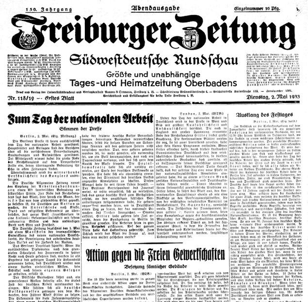 Reichskommissar Wagner erlässt erste Maßnahmen zur Sicherheit und Ordnung im Land Baden, verfügt ein Versammlungsverbot für SPD und KPD und ordnet Schutzhaft für marxistische Führer an. Am gleichen Tag verurteilt ein Schnellgericht in Freiburg den SPD-Parteifunktionär Seger wegen der Waffenfunde im Gewerkschaftshaus.