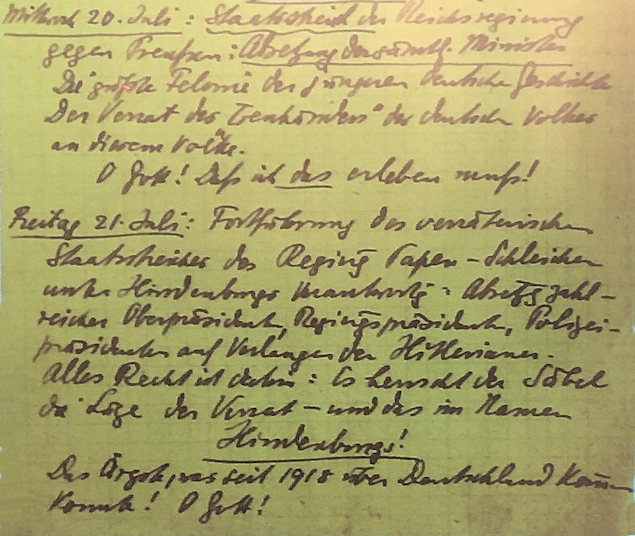 Einige Tage später räsoniert der bekannte Kunstmäzen, Schriftsteller und Diplomat Harry Graf Kessler: Nur Windbeutel und das Intrigenspiel Papen halten die neue Regierung zusammen. Hitler muss schon jetzt gemerkt haben, dass er einem Bauernfang zum Opfer gefallen ist. Er ist an Händen und Füßen in dieser Regierung gebunden und kann weder vorwärts noch rückwärts [Ullr17].